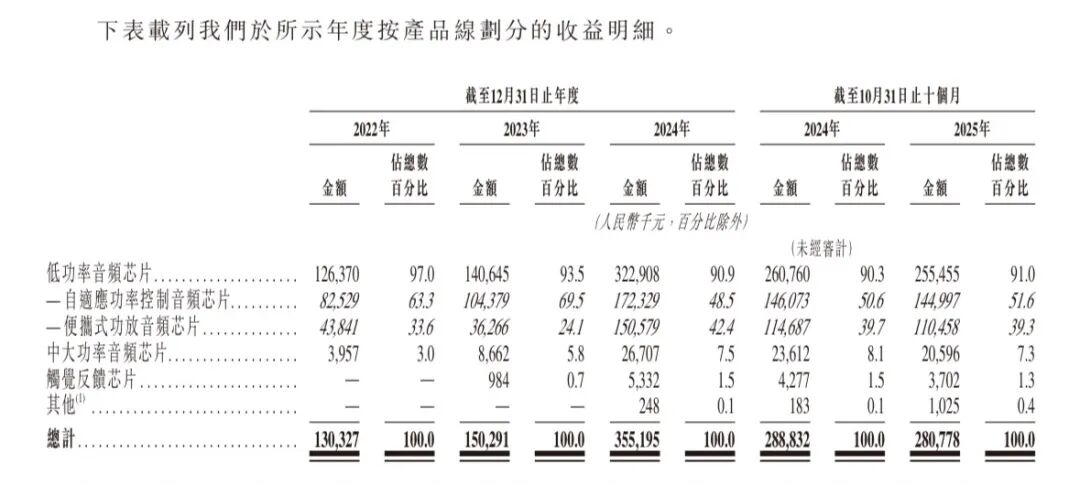 傅里叶收入高度集中在低功率音频芯片上。2025年前10个月,自适应功率控制音频芯片收入1.45亿元,占比51.6%;便携式功放音频芯片收入1.10亿元,占比39.3%,这两块加起来就超过90%了。中大功率音频芯片和触觉反馈芯片虽然毛利率更高,但占比还很小。